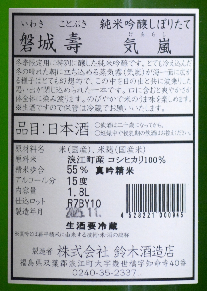 鈴木酒造店 磐城壽純米吟醸しぼりたて気嵐(けあらし)にごり生 販売価格 3,520円(税込み) 会員価格 (税込み) 通常価格 (税込み) 在庫 × 商品コード JANコード 1.8L 720ml 数量 - + 在庫なし カテゴリー 鈴木酒造店 注文年齢制限 20歳 ~ 注文手続き画面にて、生年月日を入力いただきます。 ツイートする シェアする 2025年12月 日 月 火 水 木 金 土 1 2 3 4 5 6 7 8 9 10 11 12 13 14 15 16 17 18 19 20 21 22 23 24 25 26 27 28 29 30 31 2026年01月 日 月 火 水 木 金 土 1 2 3 4 5 6 7 8 9 10 11 12 13 14 15 16 17 18 19 20 21 22 23 24 25 26 27 28 29 30 31 休業日 当店の営業は上記の通りです。黒が休業日となります 今後の状況に応じて対応して参ります.変更の可能性もございますのでその際は改めてご案内申し上げます ご理解ご協力の程宜しくお願い致します 新型コロナウイルスの早期の終息と皆様のご健康を心よりお祈り申し上げます ショッピングガイド 特定商取引法に基づく表記 個人情報保護方針 送料について 会員規約 お問い合わせ