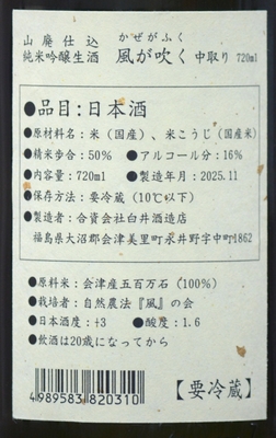 風が吹く[金]山廃純米吟醸中取り生