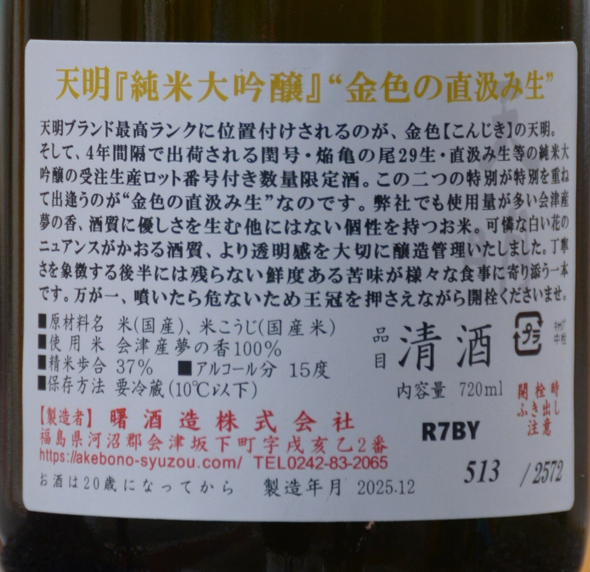 曙酒造 金色の天明純米大吟醸37直汲み生(720ml) 販売価格 3,300円(税込み) 会員価格 (税込み) 通常価格 (税込み) 在庫 ○ 商品コード JANコード 数量 - + カートに入れる カテゴリー 曙酒造 注文年齢制限 20歳 ~ 注文手続き画面にて、生年月日を入力いただきます。 ツイートする シェアする 2025年12月 日 月 火 水 木 金 土 1 2 3 4 5 6 7 8 9 10 11 12 13 14 15 16 17 18 19 20 21 22 23 24 25 26 27 28 29 30 31 2026年01月 日 月 火 水 木 金 土 1 2 3 4 5 6 7 8 9 10 11 12 13 14 15 16 17 18 19 20 21 22 23 24 25 26 27 28 29 30 31 休業日 当店の営業は上記の通りです。黒が休業日となります 今後の状況に応じて対応して参ります.変更の可能性もございますのでその際は改めてご案内申し上げます ご理解ご協力の程宜しくお願い致します 新型コロナウイルスの早期の終息と皆様のご健康を心よりお祈り申し上げます ショッピングガイド 特定商取引法に基づく表記 個人情報保護方針 送料について 会員規約 お問い合わせ